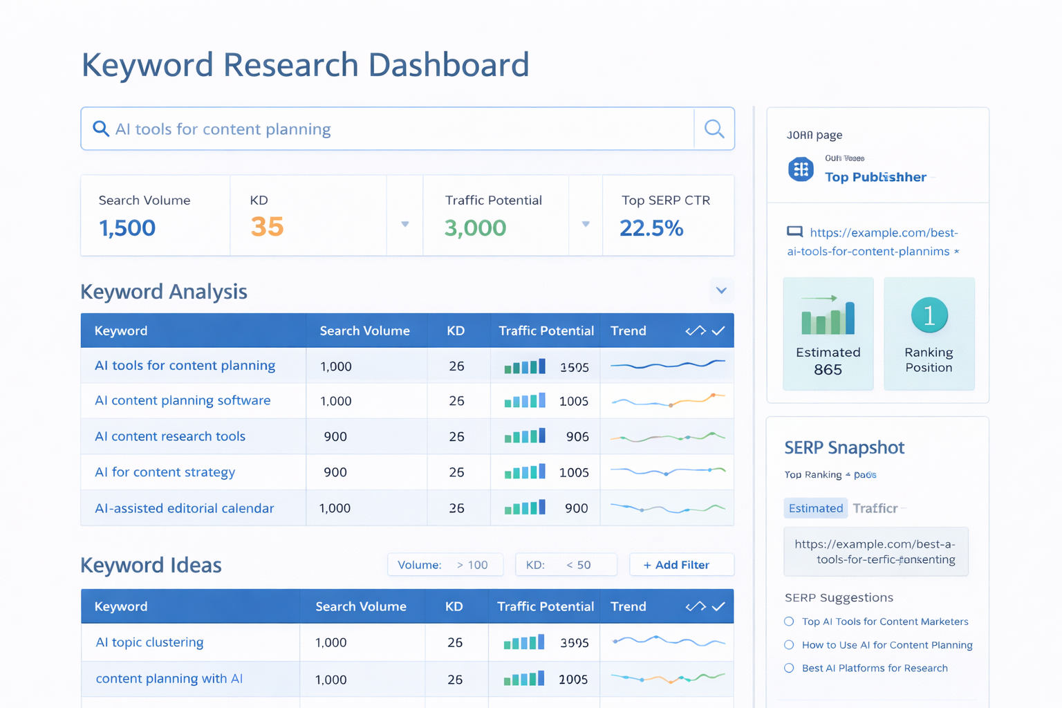 | SEO-focused content strategies | AI SEO and keyword research platforms | Provide detailed keyword data and competitor insights |