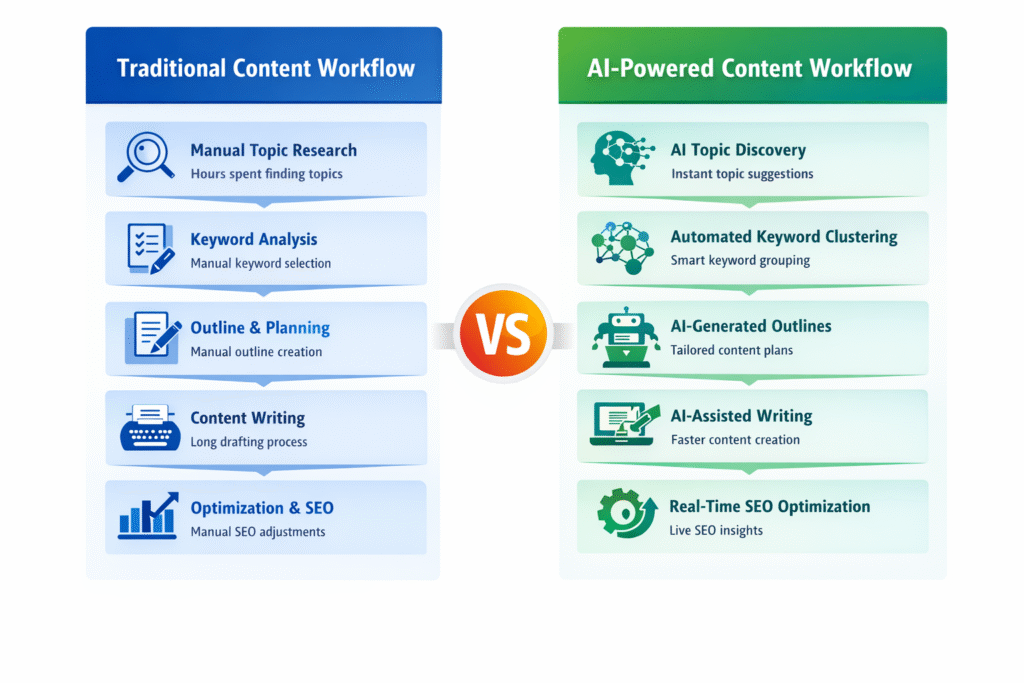 | Content planning | Manual content calendars and topic lists | AI organizes topics into structured content strategies |