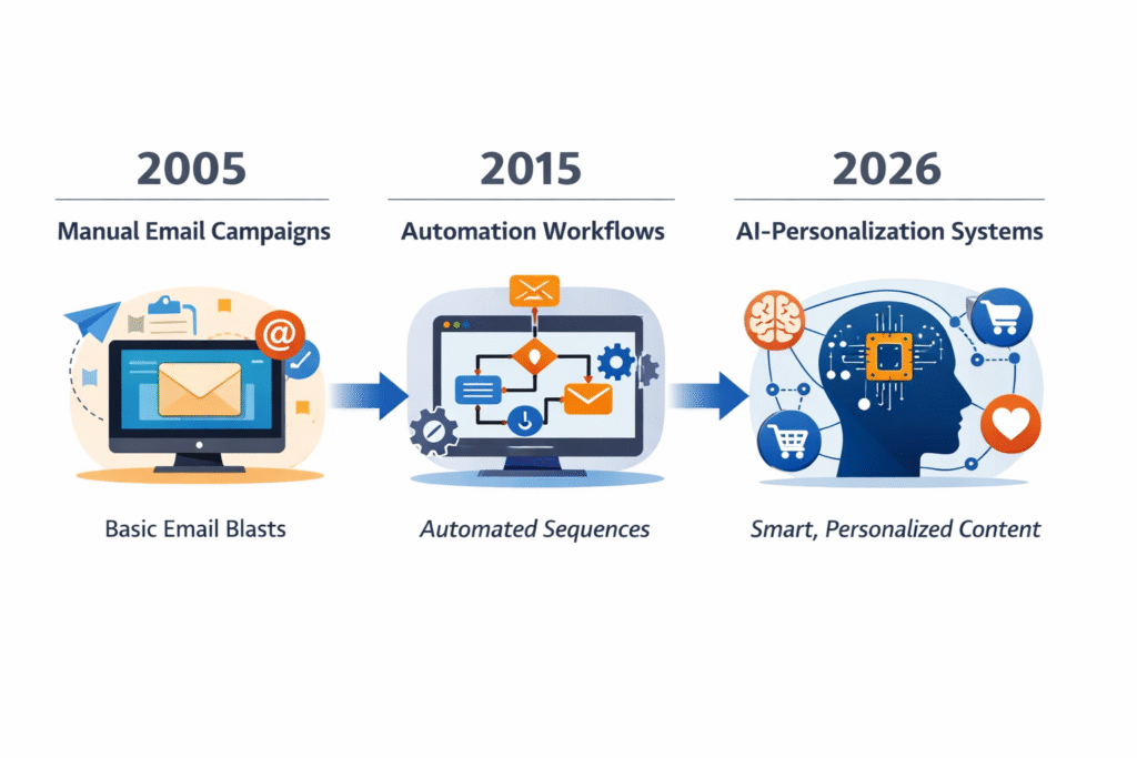 The evolution from manual email blasts in 2005, to automation platforms in 2015, and now to AI-powered personalization in 2026 reflects a clear industry trajectory: intelligence is replacing repetition.