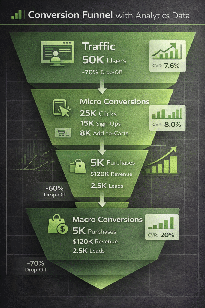It’s also important to understand the difference between micro and macro conversions. Micro conversions include actions like button clicks, video views, or newsletter sign-ups, which indicate user interest. Macro conversions represent the primary business goals, such as completed purchases or qualified leads. Tracking both helps identify where users engage and where they hesitate.