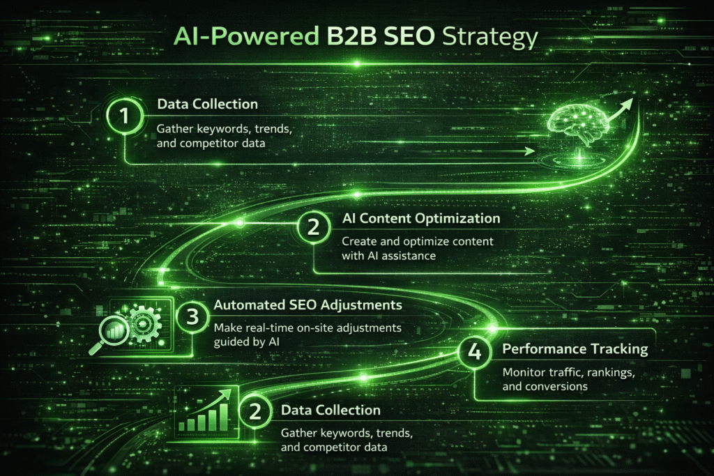 As a result, many B2B firms are moving away from traditional SEO approaches — such as one-time keyword research or static content plans — and adopting AI-powered optimization models. These models continuously monitor performance, adapt to search algorithm changes, identify new opportunities, and improve content relevance at scale.