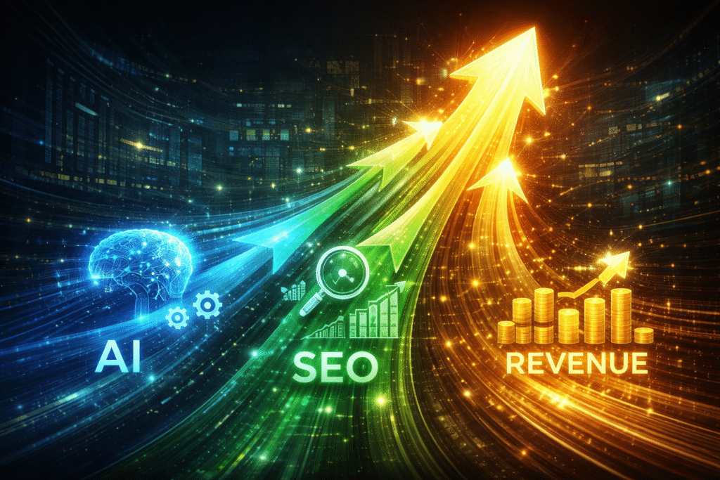 AI, SEO, and revenue growth merging into an upward business trend. - RKDMT