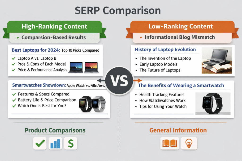 The deeper issue here is misunderstanding how Google evaluates relevance. It doesn’t just scan your content for keywords—it compares your page against what’s already ranking. If the top results are list-based comparisons and you provide a long-form theory article, you’re already misaligned. That’s the moment a search intent mistake becomes unavoidable.