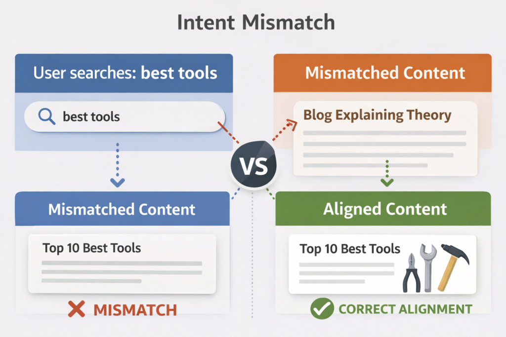 You followed the rules. You added keywords, optimized headings, maybe even built backlinks. Everything looks “SEO-friendly,” yet your content still doesn’t rank. That’s where most people get misled. Ranking failure today isn’t about doing less—it’s about doing the wrong thing for the wrong intent. This is where the real problem begins: a search intent mistake.