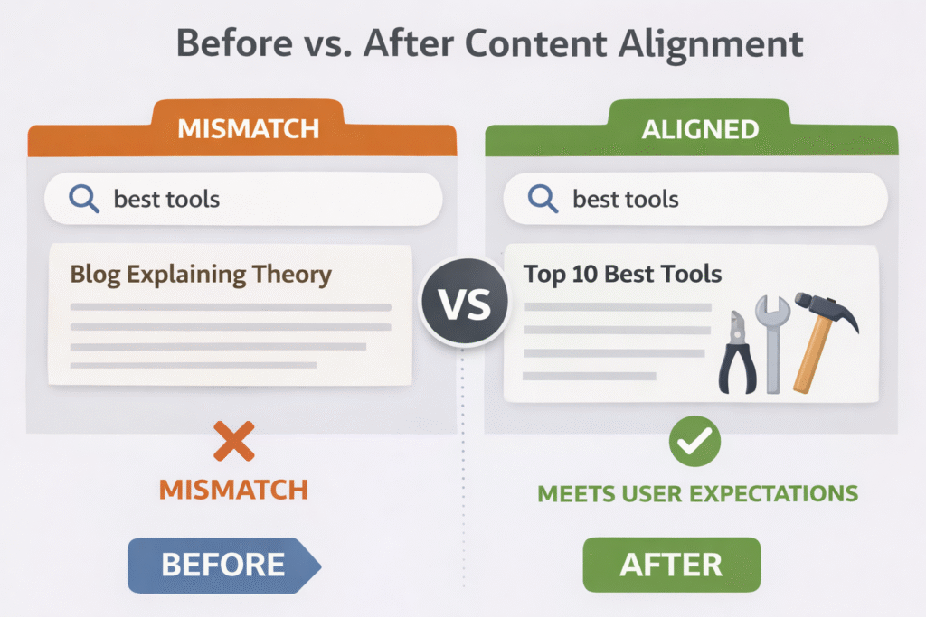 Now, imagine you publish a blog explaining “what SEO tools are” instead of listing them. Even if your content is high quality, it won’t rank. Why? Because it doesn’t match the expected outcome.
